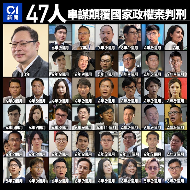民主派初選47人被控《國安法》下的「串謀顛覆國家政權罪」,45人罪成,11月19日於西九龍裁判法院判刑,刑期從4年2個月到10年不等。